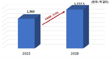 전 세계 방파제 시장 규모는 2023년 기준 1,360억 달러이며, 연평균 성장률 5.5%로 성장하여 2028년에는 1,777억 5천만 달러 규모의 시장을 형성할 것으로 예상됨