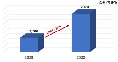전 세계 조선산업 시장규모는 2023년 기준 2,500달러로 추정되며, 연평균 성장률 2%로 성장하여 2028년에는 2,760억 달러의 규모를 형성할 것으로 예상됨