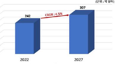 전 세계 탄성파 탐사 장치 시장은 지구 과학, 엔지니어링,건설, 에너지 등 다양한 분야에서 탄성파 탐사 장치의 수요 증가 및 탄성파 탐사 장치의 성능 향상 및 가격 하락으로 인한 접근성 증가, 신흥 시장의 성장 등의 요인에 기인하여 지속적인 성장이 예측됨§ 전 세계 탄성파 탐사 장치 시장의 규모는 2022년 242억 달러에서 2027년 307억 달러로 연평균 4.5%의 성장률을 기록할 것으로 전망됨
