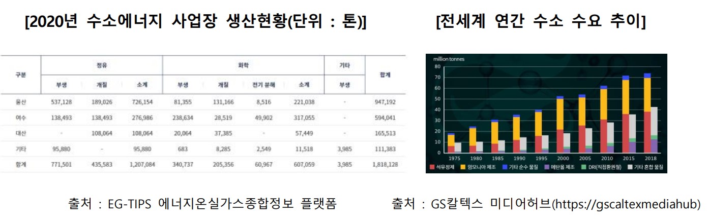 울산에서 수소 생산 52.1% (947,192톤), 소비 53.9% (874,740톤)으로 가장 높은 비중을 차지함