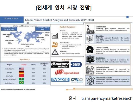 건설과 같은 산업에서 윈치에 대한 수요 증가는 윈치시장을 주도하는 핵심요소임. 유엔 인구조사국(United Nations Census Bureau)에 따르면 세계 인구는2023년까지 80억에 이를 것으로 예상됨. 이것은 인구 밀도가 높은 도시를 건설하고 적절한 기반 시설과 연결하는 것을 수반함. 한편, 개발도상국의 급격한 경제성장으로 건설수요가 증가하고 있음. 이는 윈치의 수요 증가로 이어질 것으로 생각됨 (출처 : transparencymarketresearch)