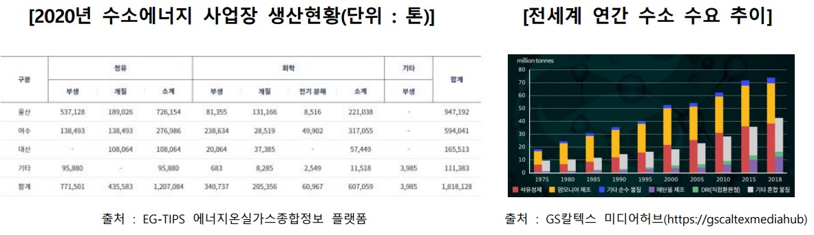 울산에서 수소 생산 52.1% (947,192톤), 소비 53.9% (874,740톤)으로 가장 높은 비중을 차지함