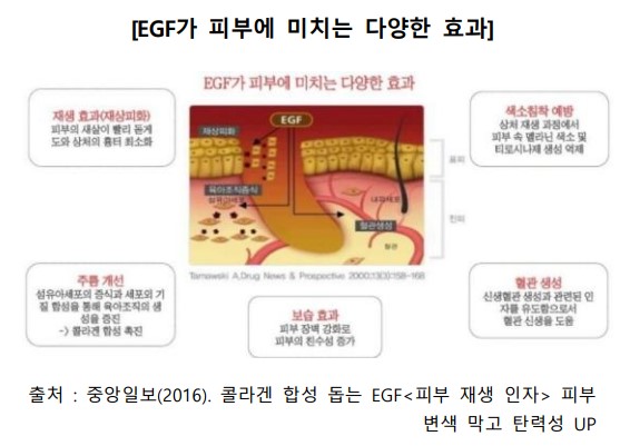 인간의 상피세포 성장인자는 상처 치유 효과가 탁월하여 일반상처, 심한 화상, 욕창, 피부괘양, 하지 정맥성 궤양 등의 치료에 사용되어 왔다. 최근에는 피부세포를 재생시키고 콜라겐의 형성을 촉진한다고 알려져 기능성 화장품 원료로도 사용되고 있음