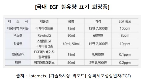 전세계 인간상피세포성장인자(Epidermal Growth Factor, EGF) 시장은 2021년에 1억 3,270만 달러로 추산되었으며, 5.9%의 연평균 성장률로 2027년에는 1억 9,830만 달러에 이를 것으로 전망됨 (출처 : businessresearchinsights)