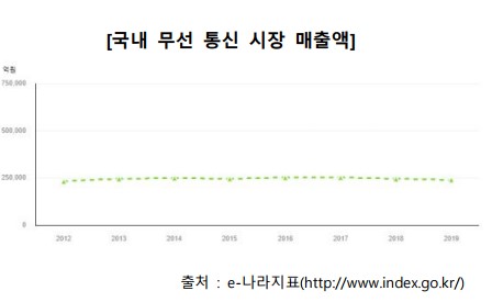 국내 무선 통신 시장은 2014년에 24조 9148억 원에서 2019년 24억 755억 원으로 일정한 규모를 유지하고 있음
