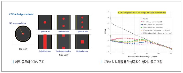 • 본 발명에서 제안하는 CSBA 개념은 가연성 흡수체를 핵연료 펠렛 내부에 장전하는 구조를 가지며, 기하구조를 유연하게 조절하여 적용되는 원자로에 맞도록 자체 차폐효과를 조절하며, 이를 통하여 효과적으로 잉여반응도를 조절한다.